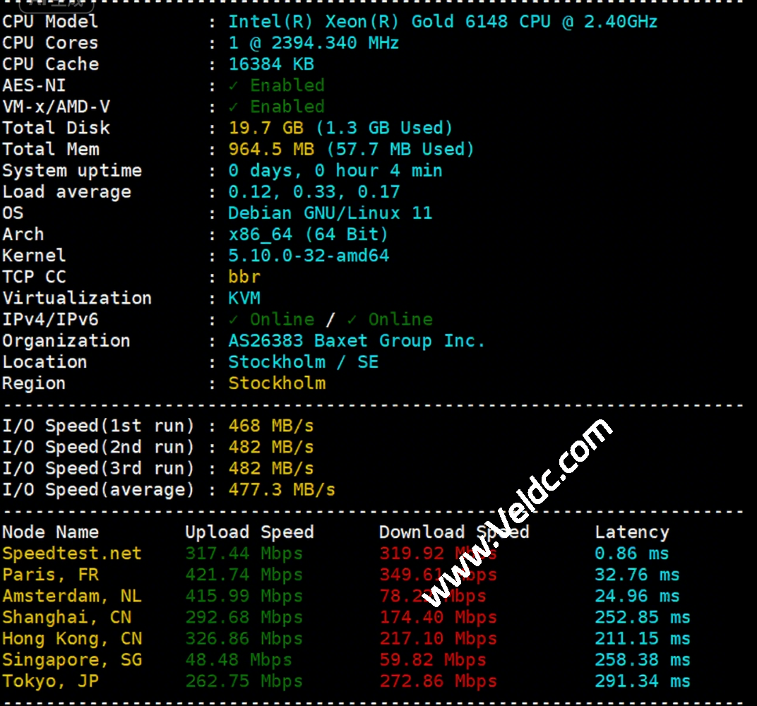 Justhost瑞典斯德哥尔摩 VPS 能为瑞典及欧洲地区的用户提供快速的低延迟网络服务,瑞典网络基础设施完善,本地和欧洲邻国访问速度快、稳定,非常适合做面向欧洲用户的网站、应用、API 服务,还可作为 CDN 边缘节点、流媒体中转节点,尤其是需要欧洲原生 IP 的业务(如 Netflix、TikTok、Spotify、AI 平台等;对于中国大陆用户使用瑞典VPS ,由于物理距离远,普通国际线路延迟普遍在 210–280ms或更高,Justhost瑞典VPS基于 OpenStack 和 KVM 技术构建,能提供较好的性能,而且可以随时切换机房和IP,现在活动促销,月付低至$2.34,下面是国外主机测评最新对于瑞典VPS的测评数据分享。