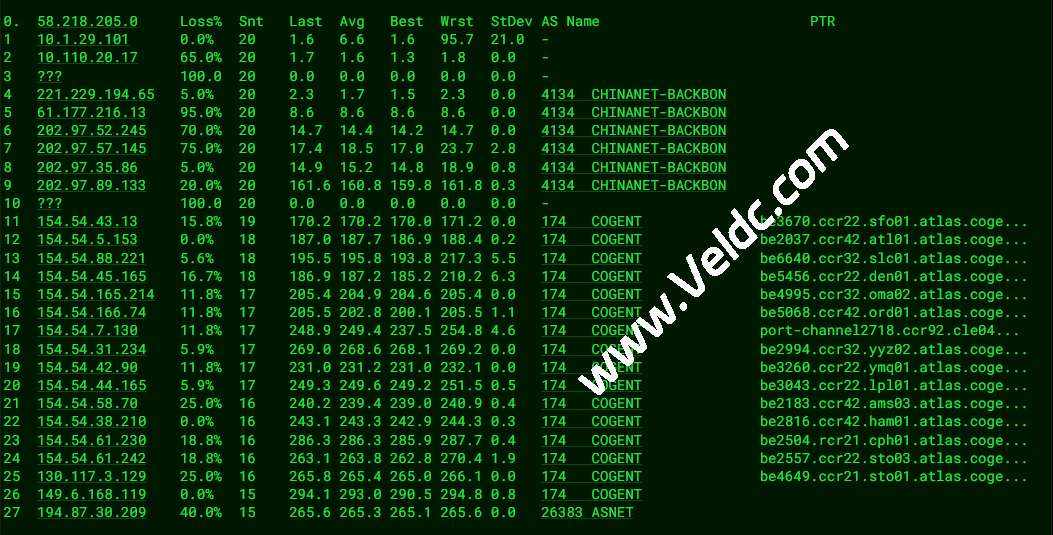 北京电信 NextTrace v1.4.2 2025-07-26T12:51:39Z cefed2a 2025/09/05 07:34:53 IP connection has been timeout(5s), please check your network [NextTrace API] preferred API IP - - ms - IP Geo Data Provider: LeoMoeAPI traceroute to 219.141.147.210, 30 hops max, 52 bytes payload, ICMP mode 1 31.192.244.1 AS26383 英国 英格兰 伦敦 ahbr company limited 0.49 ms / 2.41 ms / 0.40 ms 2 80.231.30.26 AS6453 瑞典 斯德哥尔摩省 斯德哥尔摩 tatacommunications.com ix-ge-100-0-0-66.qhar1.stk-stockholm.as6453.net 0.89 ms / 1.61 ms / 0.95 ms 3 195.219.36.19 AS6453 瑞典 斯德哥尔摩省 斯德哥尔摩 tatacommunications.com if-bundle-12-2.qcore1.stk-stockholm.as6453.net 25.84 ms / 25.28 ms / 25.04 ms 4 5.23.18.40 AS6453 挪威 奥斯陆 tatacommunications.com if-bundle-17-2.qcore1.os1-oslo.as6453.net 25.12 ms / 24.82 ms / 25.66 ms 5 195.219.138.34 AS6453 荷兰 北荷兰省 阿姆斯特丹 tatacommunications.com if-bundle-12-2.qcore2.av2-amsterdam.as6453.net 24.73 ms / 75.39 ms / * ms 6 81.173.18.65 AS4134 荷兰 北荷兰省 阿姆斯特丹 www.chinatelecom.com.cn 25.50 ms / 25.50 ms / 25.40 ms 7 202.97.40.69 AS4134 [CHINANET-BB] 中国 北京 www.chinatelecom.com.cn 电信 239.37 ms / 239.31 ms / 239.46 ms 8 202.97.84.9 AS4134 [CHINANET-BB] 中国 北京 www.chinatelecom.com.cn 电信 242.26 ms / 244.60 ms / 241.19 ms 9 202.97.94.177 AS4134 [CHINANET-BB] 中国 北京 www.chinatelecom.com.cn 电信 241.94 ms / * ms / * ms 10 * 11 * 12 106.120.254.6 AS4847 [CHINANET-GD] 中国 北京 chinatelecom.cn 263.52 ms / 244.78 ms / 244.26 ms 13 219.141.147.210 AS4847 [CHINATELECOM-BJ] 中国 北京 chinatelecom.cn 244.61 ms / 243.54 ms / 243.29 ms ---------------------------------------------------------------------- 上海电信 NextTrace v1.4.2 2025-07-26T12:51:39Z cefed2a 2025/09/05 07:35:03 IP connection has been timeout(5s), please check your network [NextTrace API] preferred API IP - - ms - IP Geo Data Provider: LeoMoeAPI traceroute to 202.96.209.133, 30 hops max, 52 bytes payload, ICMP mode 1 31.192.244.1 AS26383 英国 英格兰 伦敦 ahbr company limited 0.46 ms / 0.48 ms / 0.92 ms 2 80.231.30.26 AS6453 瑞典 斯德哥尔摩省 斯德哥尔摩 tatacommunications.com ix-ge-100-0-0-66.qhar1.stk-stockholm.as6453.net 0.62 ms / 1.29 ms / 1.00 ms 3 195.219.36.19 AS6453 瑞典 斯德哥尔摩省 斯德哥尔摩 tatacommunications.com if-bundle-12-2.qcore1.stk-stockholm.as6453.net 25.05 ms / 25.48 ms / 25.62 ms 4 5.23.18.40 AS6453 挪威 奥斯陆 tatacommunications.com if-bundle-17-2.qcore1.os1-oslo.as6453.net 26.17 ms / 25.72 ms / 26.10 ms 5 195.219.138.34 AS6453 荷兰 北荷兰省 阿姆斯特丹 tatacommunications.com if-bundle-12-2.qcore2.av2-amsterdam.as6453.net 26.50 ms / 25.73 ms / * ms 6 81.173.18.65 AS4134 荷兰 北荷兰省 阿姆斯特丹 www.chinatelecom.com.cn 25.40 ms / 47.86 ms / 25.31 ms 7 202.97.74.97 AS4134 [CHINANET-BB] 中国 上海 X-I www.chinatelecom.com.cn 电信 309.30 ms / * ms / * ms 8 202.97.12.205 AS4134 [CHINANET-BB] 中国 上海 www.chinatelecom.com.cn 电信 231.52 ms / * ms / * ms 9 * 10 101.95.120.93 AS4812 [CHINANET-SH] 中国 上海 chinatelecom.cn 电信 243.39 ms / 248.67 ms / 246.36 ms 11 61.152.1.166 AS4812 [CHINANET-SH] 中国 上海 chinatelecom.cn 248.20 ms / 250.79 ms / 245.21 ms 12 202.96.209.133 AS4812 [CHINANET-SH] 中国 上海 chinatelecom.cn 电信 243.24 ms / 243.14 ms / 243.19 ms ---------------------------------------------------------------------- 深圳电信 NextTrace v1.4.2 2025-07-26T12:51:39Z cefed2a 2025/09/05 07:35:13 IP connection has been timeout(5s), please check your network [NextTrace API] preferred API IP - - ms - IP Geo Data Provider: LeoMoeAPI traceroute to 58.60.188.222, 30 hops max, 52 bytes payload, ICMP mode 1 31.192.244.1 AS26383 英国 英格兰 伦敦 ahbr company limited 0.63 ms / 0.70 ms / 0.65 ms 2 80.231.30.26 AS6453 瑞典 斯德哥尔摩省 斯德哥尔摩 tatacommunications.com ix-ge-100-0-0-66.qhar1.stk-stockholm.as6453.net 0.66 ms / 1.21 ms / 0.73 ms 3 195.219.36.19 AS6453 瑞典 斯德哥尔摩省 斯德哥尔摩 tatacommunications.com if-bundle-12-2.qcore1.stk-stockholm.as6453.net 25.65 ms / 25.87 ms / 25.70 ms 4 5.23.18.40 AS6453 挪威 奥斯陆 tatacommunications.com if-bundle-17-2.qcore1.os1-oslo.as6453.net 27.06 ms / 25.29 ms / 25.80 ms 5 * 6 81.173.18.65 AS4134 荷兰 北荷兰省 阿姆斯特丹 www.chinatelecom.com.cn 25.23 ms / 25.41 ms / 25.36 ms 7 202.97.116.249 AS4134 [CHINANET-BB] 中国 香港 www.chinatelecom.com.cn 电信 291.84 ms / 291.25 ms / 291.08 ms 8 * 9 * 10 * 11 * 12 * 13 * 14 * 15 * 16 * 17 * 18 * 19 * 20 * 21 * 22 * 23 * 24 * 25 * 26 * 27 * 28 * 29 *