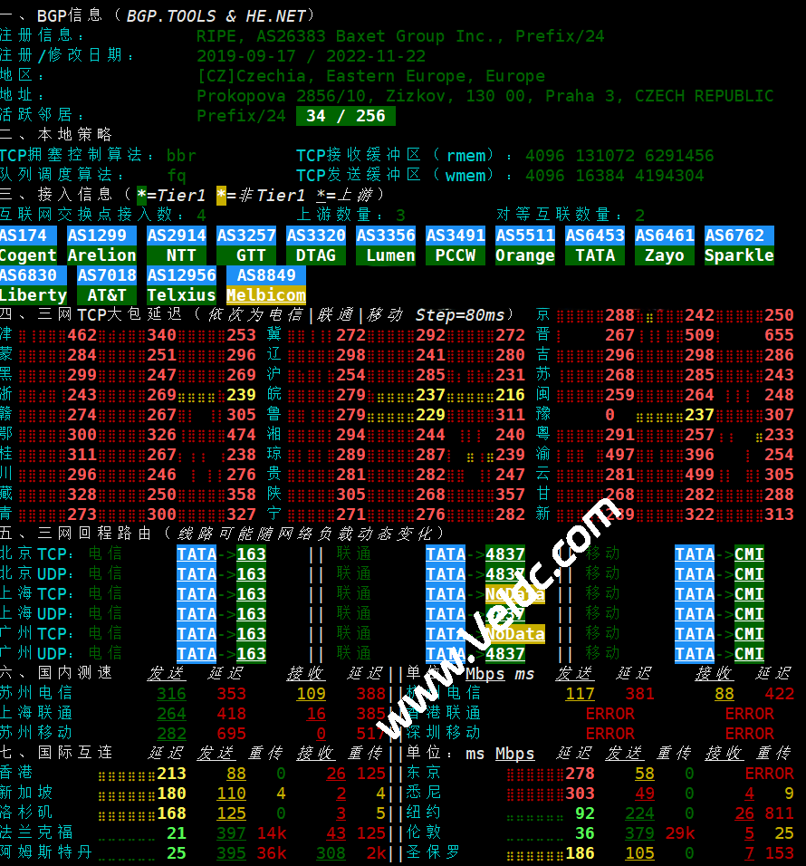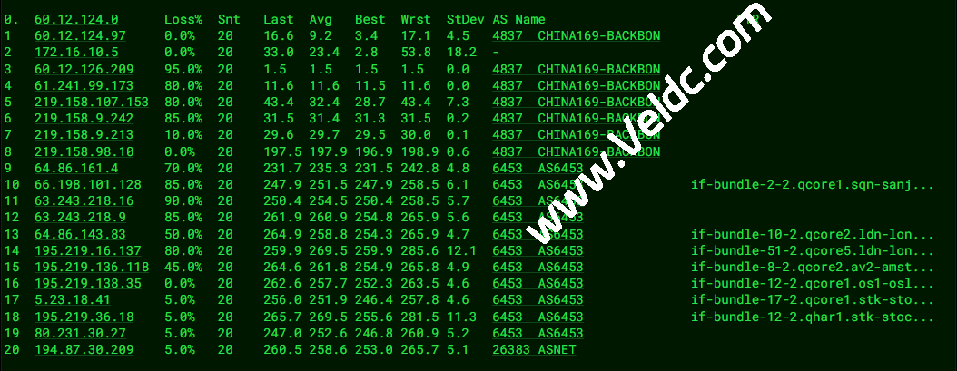 北京联通 NextTrace v1.4.2 2025-07-26T12:51:39Z cefed2a 2025/09/05 07:35:27 IP connection has been timeout(5s), please check your network [NextTrace API] preferred API IP - - ms - IP Geo Data Provider: LeoMoeAPI traceroute to 202.106.50.1, 30 hops max, 52 bytes payload, ICMP mode 1 31.192.244.1 AS26383 英国 英格兰 伦敦 ahbr company limited 1.33 ms / 1.22 ms / 0.48 ms 2 80.231.30.26 AS6453 瑞典 斯德哥尔摩省 斯德哥尔摩 tatacommunications.com ix-ge-100-0-0-66.qhar1.stk-stockholm.as6453.net 2.82 ms / 1.70 ms / 0.73 ms 3 195.219.36.19 AS6453 瑞典 斯德哥尔摩省 斯德哥尔摩 tatacommunications.com if-bundle-12-2.qcore1.stk-stockholm.as6453.net 18.07 ms / 18.89 ms / 18.67 ms 4 195.219.68.80 AS6453 德国 黑森 美因河畔法兰克福 tatacommunications.com if-bundle-19-2.qcore1.fnm-frankfurt.as6453.net 18.39 ms / 18.87 ms / 18.71 ms 5 195.219.69.110 AS6453 德国 黑森 美因河畔法兰克福 tatacommunications.com if-ae-56-2.tcore1.fnm-frankfurt.as6453.net 18.89 ms / 19.11 ms / 18.57 ms 6 5.23.30.17 AS6453 德国 黑森 美因河畔法兰克福 tatacommunications.com if-ae-9-2.tcore2.fr0-frankfurt.as6453.net 18.61 ms / 19.34 ms / 18.73 ms 7 * 8 * 9 202.106.50.1 AS4808 [UNICOM-BJ] 中国 北京 丰台区 中国联通 联通 227.69 ms / 227.79 ms / 227.77 ms ---------------------------------------------------------------------- 上海联通 NextTrace v1.4.2 2025-07-26T12:51:39Z cefed2a 2025/09/05 07:35:36 IP connection has been timeout(5s), please check your network [NextTrace API] preferred API IP - - ms - IP Geo Data Provider: LeoMoeAPI traceroute to 210.22.97.1, 30 hops max, 52 bytes payload, ICMP mode 1 31.192.244.1 AS26383 英国 英格兰 伦敦 ahbr company limited 3.37 ms / 0.39 ms / 0.72 ms 2 80.231.30.26 AS6453 瑞典 斯德哥尔摩省 斯德哥尔摩 tatacommunications.com ix-ge-100-0-0-66.qhar1.stk-stockholm.as6453.net 1.23 ms / 51.55 ms / * ms 3 195.219.36.19 AS6453 瑞典 斯德哥尔摩省 斯德哥尔摩 tatacommunications.com if-bundle-12-2.qcore1.stk-stockholm.as6453.net 18.15 ms / 18.22 ms / 18.83 ms 4 195.219.68.80 AS6453 德国 黑森 美因河畔法兰克福 tatacommunications.com if-bundle-19-2.qcore1.fnm-frankfurt.as6453.net 19.13 ms / 19.05 ms / 18.76 ms 5 195.219.69.110 AS6453 德国 黑森 美因河畔法兰克福 tatacommunications.com if-ae-56-2.tcore1.fnm-frankfurt.as6453.net 18.70 ms / 29.24 ms / 18.67 ms 6 5.23.30.17 AS6453 德国 黑森 美因河畔法兰克福 tatacommunications.com if-ae-9-2.tcore1.fr0-frankfurt.as6453.net 18.72 ms / 18.53 ms / 18.70 ms 7 219.158.9.201 AS4837 [CU169-BACKBONE] 中国 北京 chinaunicom.cn 联通 258.08 ms / * ms / * ms 8 * 9 * 10 * 11 210.22.97.1 AS17621 [CNCNET-SH] 中国 上海 闵行区 chinaunicom.cn 联通 304.09 ms / 302.85 ms / 302.46 ms ---------------------------------------------------------------------- 深圳联通 NextTrace v1.4.2 2025-07-26T12:51:39Z cefed2a 2025/09/05 07:35:46 IP connection has been timeout(5s), please check your network [NextTrace API] preferred API IP - - ms - IP Geo Data Provider: LeoMoeAPI traceroute to 210.21.196.6, 30 hops max, 52 bytes payload, ICMP mode 1 31.192.244.1 AS26383 英国 英格兰 伦敦 ahbr company limited 0.76 ms / 0.71 ms / 1.02 ms 2 80.231.30.26 AS6453 瑞典 斯德哥尔摩省 斯德哥尔摩 tatacommunications.com ix-ge-100-0-0-66.qhar1.stk-stockholm.as6453.net 1.64 ms / 1.13 ms / 3.90 ms 3 195.219.36.19 AS6453 瑞典 斯德哥尔摩省 斯德哥尔摩 tatacommunications.com if-bundle-12-2.qcore1.stk-stockholm.as6453.net 18.99 ms / 19.52 ms / 19.23 ms 4 195.219.68.80 AS6453 德国 黑森 美因河畔法兰克福 tatacommunications.com if-bundle-19-2.qcore1.fnm-frankfurt.as6453.net 19.18 ms / 18.17 ms / 20.23 ms 5 195.219.69.110 AS6453 德国 黑森 美因河畔法兰克福 tatacommunications.com if-ae-56-2.tcore1.fnm-frankfurt.as6453.net 18.80 ms / 19.06 ms / 19.08 ms 6 5.23.30.17 AS6453 德国 黑森 美因河畔法兰克福 tatacommunications.com if-ae-9-2.tcore1.fr0-frankfurt.as6453.net 18.38 ms / 18.41 ms / 20.08 ms 7 * 8 * 9 221.4.0.74 AS17816 [UNICOM-GD] 中国 广东 深圳 chinaunicom.cn 联通 305.76 ms / * ms / * ms 10 120.80.144.34 AS17623 [APNIC-AP] 中国 广东 深圳 chinaunicom.cn 联通 280.80 ms / 300.64 ms / 275.80 ms 11 210.21.196.6 AS17623 中国 广东 深圳 宝安区 chinaunicom.cn 联通 256.63 ms / 256.85 ms / 256.68 ms
