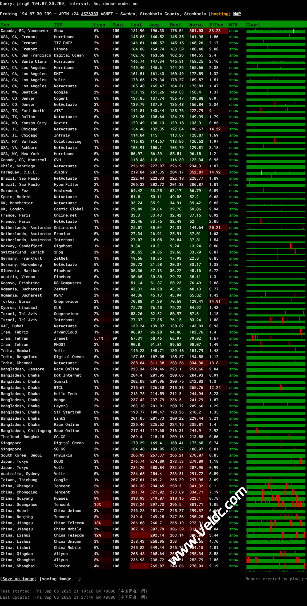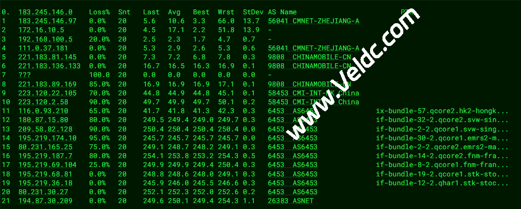 北京移动 NextTrace v1.4.2 2025-07-26T12:51:39Z cefed2a 2025/09/05 07:35:55 IP connection has been timeout(5s), please check your network [NextTrace API] preferred API IP - - ms - IP Geo Data Provider: LeoMoeAPI traceroute to 221.179.155.161, 30 hops max, 52 bytes payload, ICMP mode 1 31.192.244.1 AS26383 英国 英格兰 伦敦 ahbr company limited 1.05 ms / 0.58 ms / 0.91 ms 2 80.231.30.26 AS6453 瑞典 斯德哥尔摩省 斯德哥尔摩 tatacommunications.com ix-ge-100-0-0-66.qhar1.stk-stockholm.as6453.net 1.10 ms / 1.68 ms / 1.98 ms 3 195.219.36.19 AS6453 瑞典 斯德哥尔摩省 斯德哥尔摩 tatacommunications.com if-bundle-12-2.qcore1.stk-stockholm.as6453.net 18.70 ms / 18.02 ms / 18.25 ms 4 195.219.68.80 AS6453 德国 黑森 美因河畔法兰克福 tatacommunications.com if-bundle-19-2.qcore1.fnm-frankfurt.as6453.net 18.37 ms / 18.93 ms / 17.93 ms 5 195.219.69.110 AS6453 德国 黑森 美因河畔法兰克福 tatacommunications.com if-ae-56-2.tcore1.fnm-frankfurt.as6453.net 19.17 ms / 18.77 ms / 18.51 ms 6 195.219.156.151 AS6453 [FRN-FNM] 德国 黑森 美因河畔法兰克福 tatacommunications.com if-ae-29-2.tcore2.fnm-frankfurt.as6453.net 18.98 ms / 18.32 ms / 18.91 ms 7 221.183.46.250 AS9808 [CMNET] 中国 北京 I-C chinamobileltd.com 移动 248.65 ms / 249.62 ms / * ms 8 * 9 221.183.46.178 AS9808 [CMNET] 中国 北京 chinamobileltd.com 移动 251.29 ms / 250.76 ms / 251.01 ms 10 221.183.130.142 AS9808 [CMNET] 中国 北京 chinamobileltd.com 移动 249.59 ms / * ms / * ms 11 221.179.155.161 AS56048 [CMNET] 中国 北京 bj.10086.cn 移动 252.29 ms / 253.65 ms / 252.30 ms ---------------------------------------------------------------------- 上海移动 NextTrace v1.4.2 2025-07-26T12:51:39Z cefed2a 2025/09/05 07:36:04 IP connection has been timeout(5s), please check your network [NextTrace API] preferred API IP - - ms - IP Geo Data Provider: LeoMoeAPI traceroute to 211.136.112.200, 30 hops max, 52 bytes payload, ICMP mode 1 31.192.244.1 AS26383 英国 英格兰 伦敦 ahbr company limited 0.79 ms / 0.47 ms / 0.52 ms 2 80.231.30.26 AS6453 瑞典 斯德哥尔摩省 斯德哥尔摩 tatacommunications.com ix-ge-100-0-0-66.qhar1.stk-stockholm.as6453.net 1.45 ms / 0.60 ms / 1.50 ms 3 195.219.36.19 AS6453 瑞典 斯德哥尔摩省 斯德哥尔摩 tatacommunications.com if-bundle-12-2.qcore1.stk-stockholm.as6453.net 18.75 ms / 18.64 ms / 18.32 ms 4 195.219.68.80 AS6453 德国 黑森 美因河畔法兰克福 tatacommunications.com if-bundle-19-2.qcore1.fnm-frankfurt.as6453.net 19.58 ms / 18.93 ms / 19.41 ms 5 * 6 195.219.87.56 AS6453 [TATA-R] 德国 黑森 美因河畔法兰克福 tatacommunications.com if-ae-55-2.tcore2.fnm-frankfurt.as6453.net 18.44 ms / 18.36 ms / 18.55 ms 7 221.183.89.33 AS9808 [CMNET] 中国 上海 I-C chinamobileltd.com 移动 201.34 ms / 201.39 ms / 201.31 ms 8 * 9 * 10 * 11 211.136.112.252 AS24400 [CMNET] 中国 上海 sh.10086.cn 移动 208.45 ms / 208.67 ms / 209.13 ms 12 211.136.112.200 AS24400 [CMNET] 中国 上海 浦东新区 sh.10086.cn 移动 214.36 ms / 213.93 ms / 214.24 ms ---------------------------------------------------------------------- 深圳移动 NextTrace v1.4.2 2025-07-26T12:51:39Z cefed2a 2025/09/05 07:36:14 IP connection has been timeout(5s), please check your network [NextTrace API] preferred API IP - - ms - IP Geo Data Provider: LeoMoeAPI traceroute to 120.196.165.24, 30 hops max, 52 bytes payload, ICMP mode 1 31.192.244.1 AS26383 英国 英格兰 伦敦 ahbr company limited 0.44 ms / 0.64 ms / 0.60 ms 2 80.231.30.26 AS6453 瑞典 斯德哥尔摩省 斯德哥尔摩 tatacommunications.com ix-ge-100-0-0-66.qhar1.stk-stockholm.as6453.net 1.50 ms / 1.76 ms / 1.33 ms 3 195.219.36.19 AS6453 瑞典 斯德哥尔摩省 斯德哥尔摩 tatacommunications.com if-bundle-12-2.qcore1.stk-stockholm.as6453.net 17.99 ms / 18.45 ms / 17.89 ms 4 195.219.68.80 AS6453 德国 黑森 美因河畔法兰克福 tatacommunications.com if-bundle-19-2.qcore1.fnm-frankfurt.as6453.net 18.38 ms / 18.05 ms / 18.96 ms 5 * 6 195.219.87.56 AS6453 [TATA-R] 德国 黑森 美因河畔法兰克福 tatacommunications.com if-ae-55-2.tcore2.fnm-frankfurt.as6453.net 21.02 ms / 20.11 ms / 21.53 ms 7 221.183.92.21 AS9808 [CMNET] 中国 广东 广州 I-C chinamobileltd.com 移动 226.03 ms / 275.16 ms / * ms 8 * 9 221.183.71.82 AS9808 [CMNET] 中国 广东 广州 chinamobileltd.com 移动 226.60 ms / 226.25 ms / 226.10 ms 10 221.183.110.170 AS9808 [CMNET] 中国 广东 广州 chinamobileltd.com 移动 232.23 ms / 232.19 ms / * ms 11 120.196.165.24 AS56040 [APNIC-AP] 中国 广东 深圳 gd.10086.cn 移动 226.25 ms / 225.59 ms / 225.96 ms