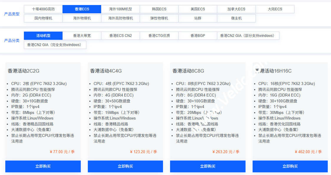 | 地区 | CPU | 内存 | 带宽 | 购买 |