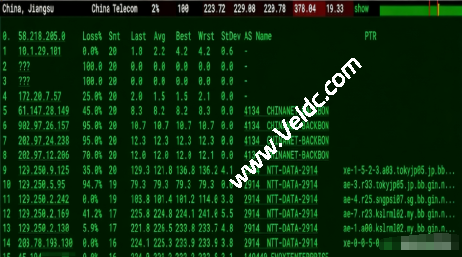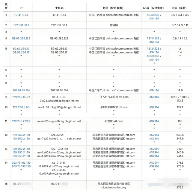 电信去程:国内段走中国电信骨干网(AS4134),随后出口至日本东京接入 NTT 线路,再中转至新加坡,短暂停留后继续前往目的地马来西亚,最终抵达机房。