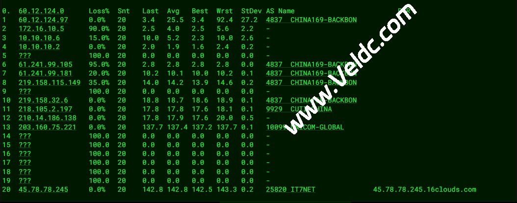 我们使用对中国电信、联通、移动以及教育网进行了回程路由测试,结果令人惊喜:这是标准的三网高端旗舰线路。