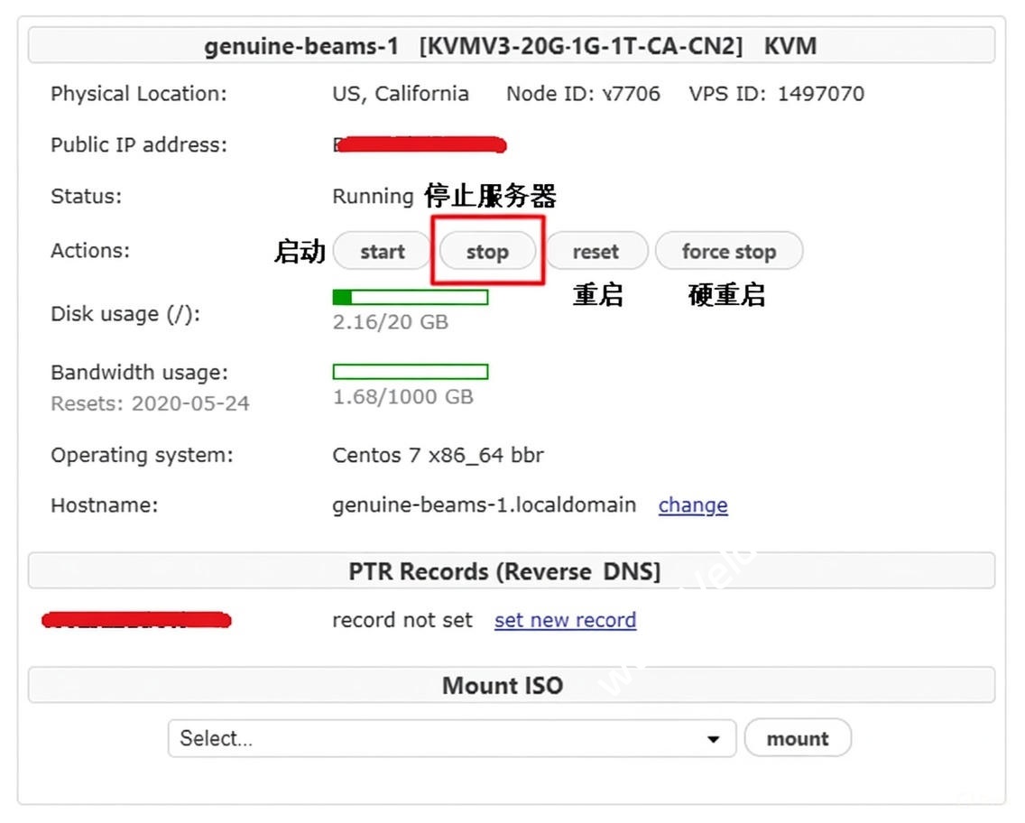 - 点击 Stop(或 Force Stop)按钮,等待 VPS 状态变为 Stopped。