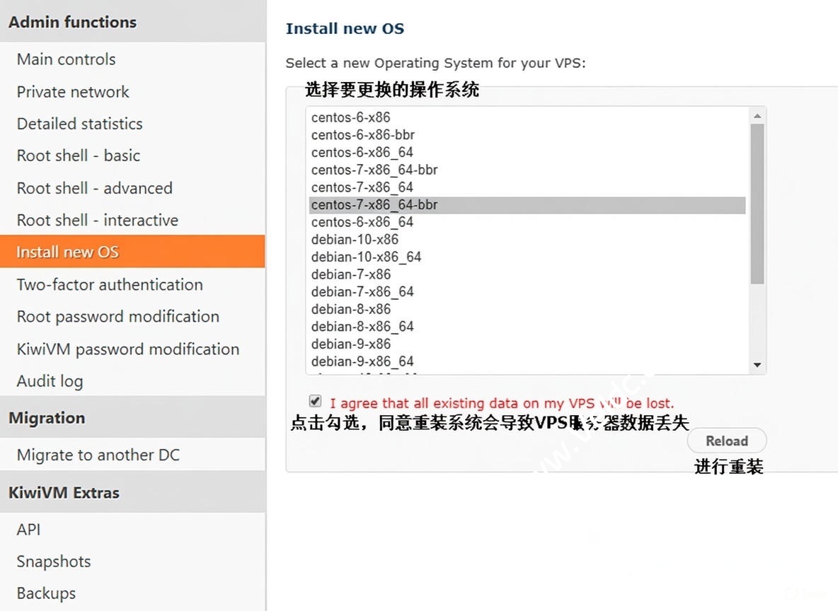 - 勾选 I agree that all existing data on my VPS will be lost(同意数据丢失)