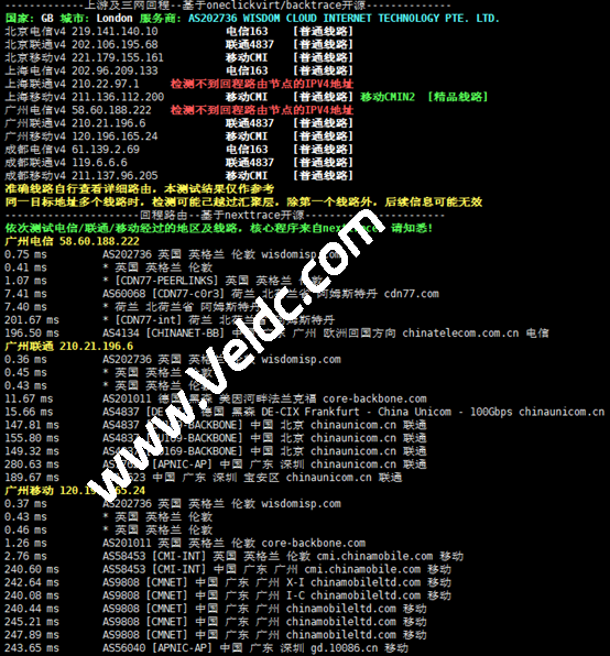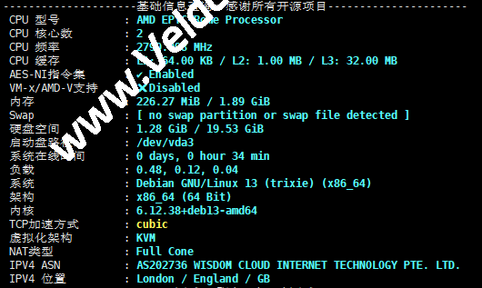 AMD EPYC 7002,主频2800MHz,底层为KVM虚拟,启用了BBR,不支持IPv6,上游提供商为wisdomisp,归属地为英国伦敦