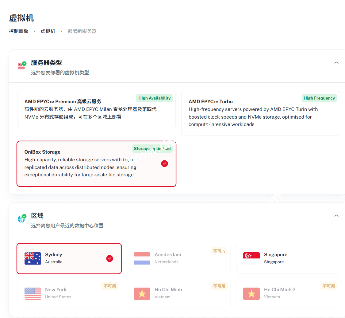 存储虚拟机采用 NVMe 块存储作为根磁盘,HDD 块存储作为数据磁盘,所有这些都由 Ceph 提供支持,并采用三重复制,以确保高可用性、强大的数据持久性和数据完整性。可选悉尼和新加坡机房。