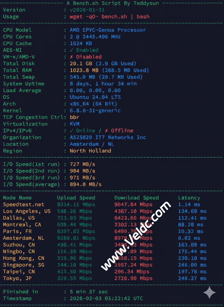 以下是针对这台搬瓦工荷兰 EUNL_1 VPS 的详细硬件与带宽性能总结,通过 bench.sh 进行测试: