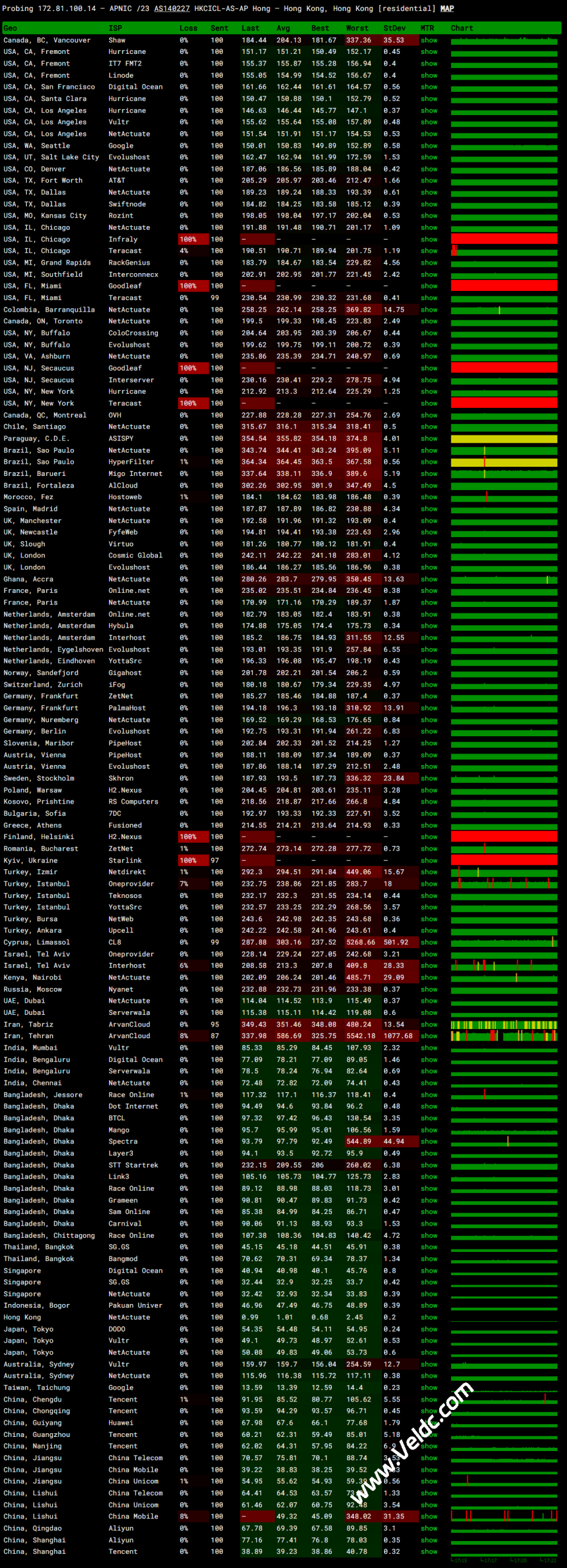 - 回国延迟优秀:中国大陆节点平均延迟在 30-90ms 区间,大部分南方/东部城市 <70ms,北方/西部稍高但无明显瓶颈。丢包率极低(绝大部分 0-1%),属于香港机房中的顶尖回国优化水平,与之前 ITDOG 62ms 平均一致,甚至更优。