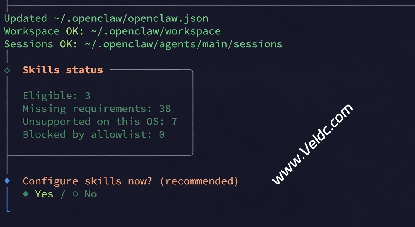 然后是选择 Skills 配置,同样可以选择 No 先跳过。因为选择了 Yes 也不一定能安装成功。安装需要 homebrew,而我们目前还没装。