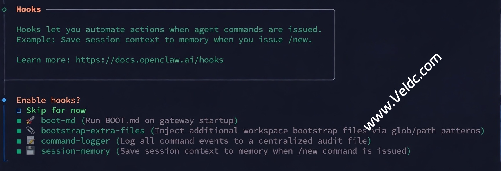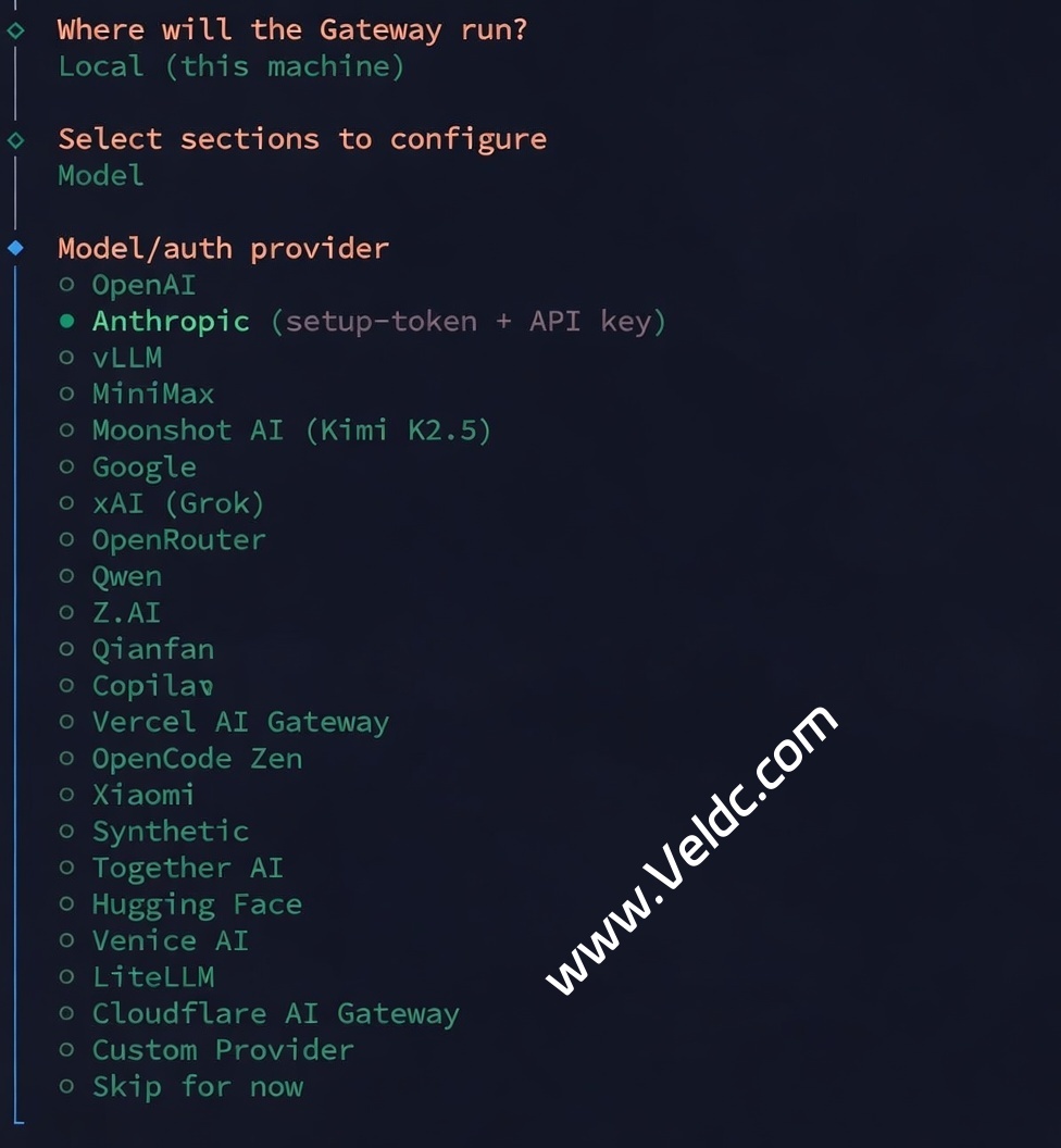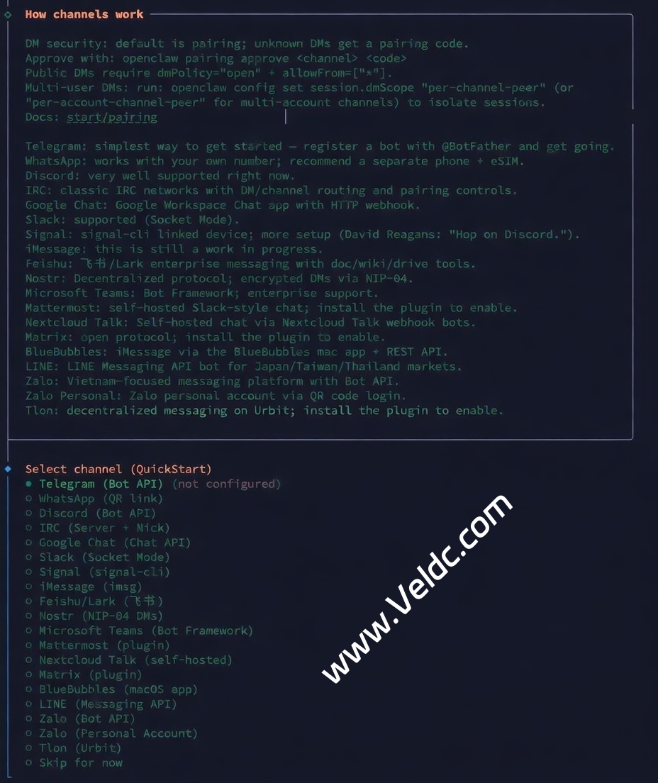 然后会让你选择一个 channel,我们可以先跳过(Skip for now),还记得最开始说的吗,我们的目标是赶紧装上,其他的所有都可以让 OpenClaw 自己搞定。