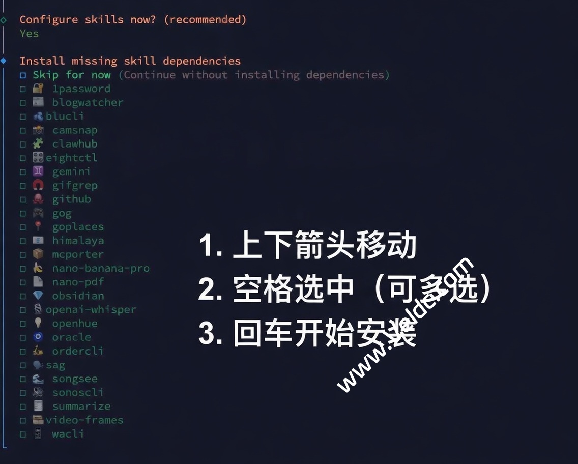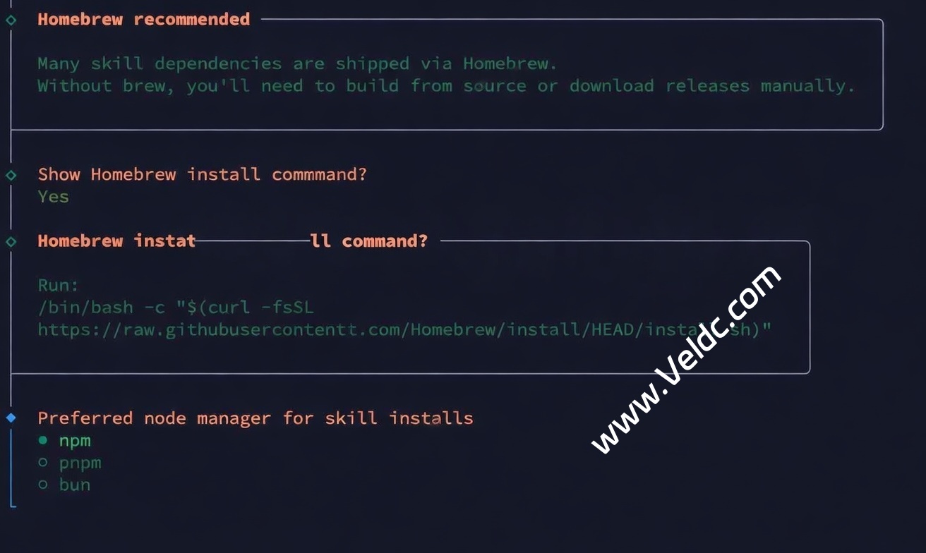 然后会问你是否需要显示 Homebrew 安装命令,我们可以选择是,然后记下来,然后自己装,也可以后续直接让 OpenClaw 自己搞定安装。