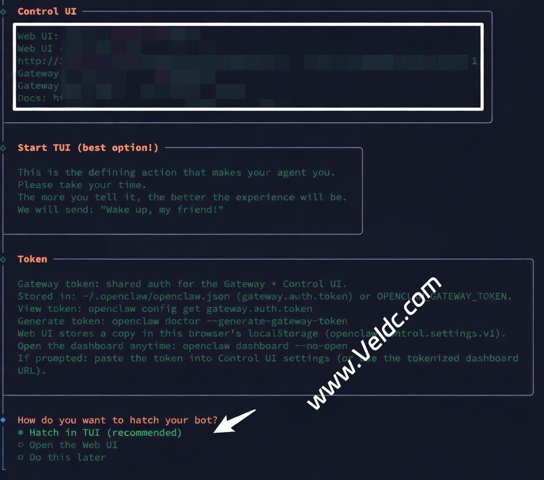 让我们选择 Hatch in TUI 启动试一下。如果出现 Wake up, my friend!,就是安装成功了。