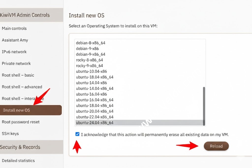 然后点击左侧的 Install new OS,选择 ubuntu-24.04-x86_64 这个系统,勾选同意条款,然后点击 Reload,会有一个弹出框,确认,就可以开始重装系统。