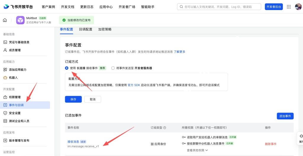 im.message.receive_v1事件且选择了「长连接」 - 确认应用已发布:版本管理 → 确认有已发布的版本